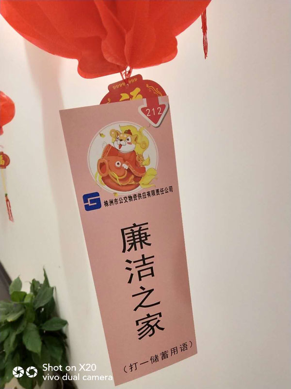 "奉公德乃大,廉潔品自高(猜一紀(jì)檢名詞),這是什么呢?哦,我知道了!"參加活動(dòng)的小李拿著謎語(yǔ),趕快走到兌獎(jiǎng)處,大聲的說(shuō):"這個(gè)謎底是免予起訴。"……3月2日,在傳統(tǒng)元宵佳節(jié)即將來(lái)臨之際,由株洲公交物資中心黨支部主辦的"瑞犬送春春意濃,幸福公交慶元宵"猜燈謎活動(dòng)在公交公司成功舉辦。本次活動(dòng)最大的亮點(diǎn)就在于株洲公交將黨風(fēng)廉政建設(shè)、黨紀(jì)黨規(guī)等知識(shí)也藏進(jìn)了五彩繽紛的小燈謎中。